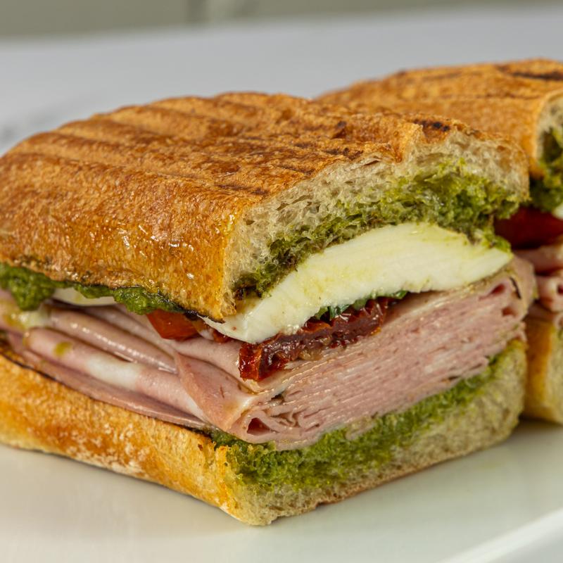 Olive Oil, Pesto, Italian Mortadella, Sun Dried Tomatoes, Fresh Mozzarella, Basil, Balsamic Glaze