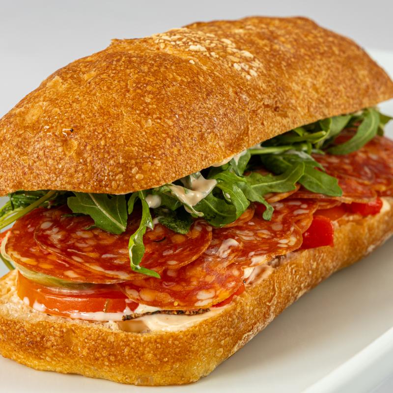 Spicy Aioli, Salami Calabrese, Tomato, Mozzarella, Marinated Bell Pepper, Arugula, Artichoke