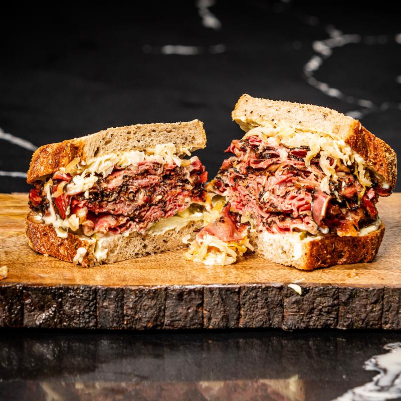 Sauerkraut, New York Style Pastrami, Provolone, Mayo-Mustard, Pickle